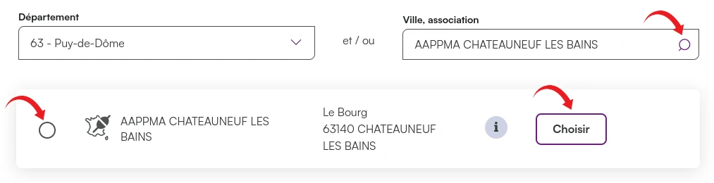 Une fois redirigé sur le site cartedepeche.fr, Renseignez les champs « Département » et « Ville association » puis cliquez sur la petite loupe, pour choisir notre aappma