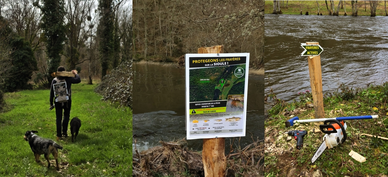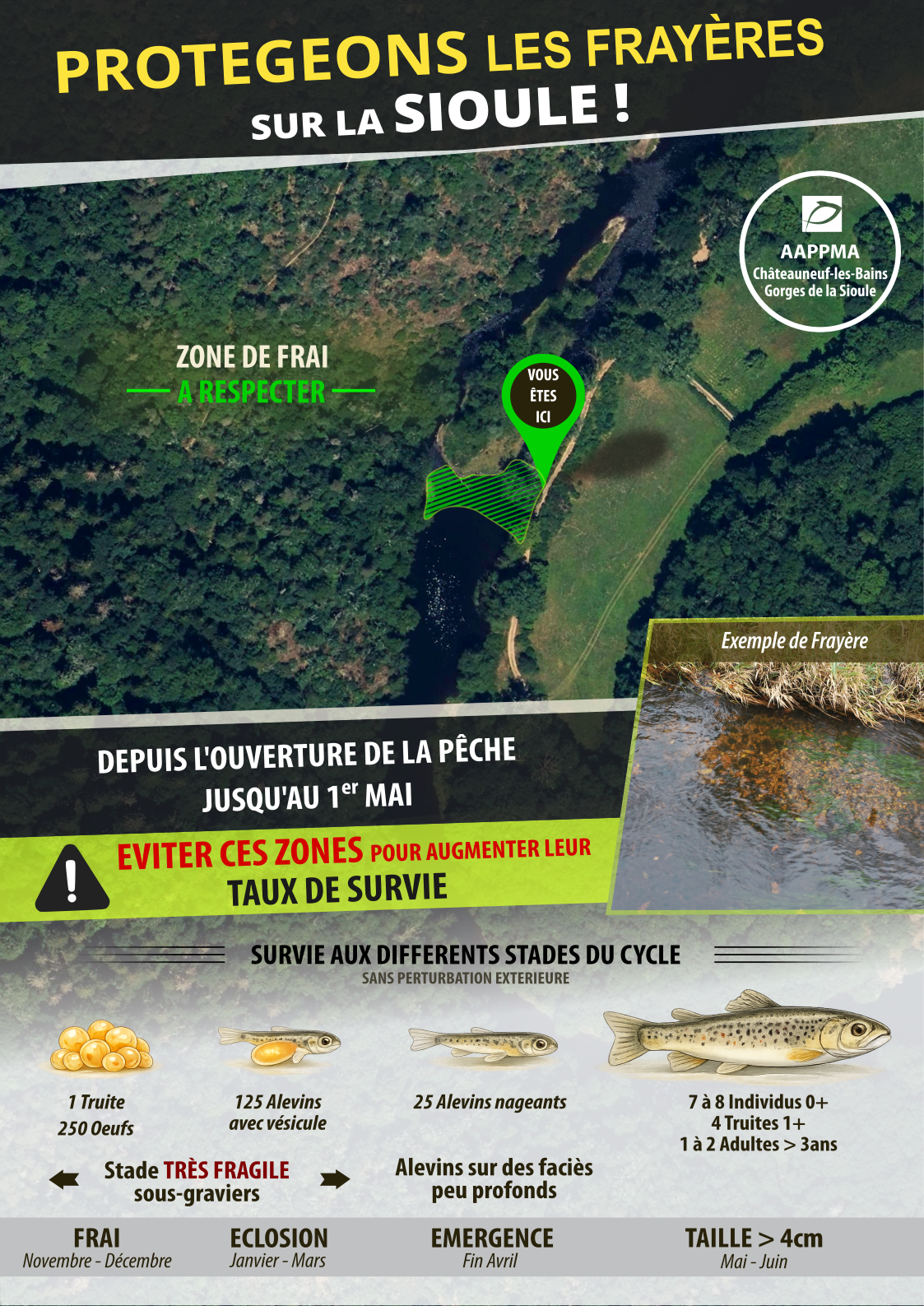 L’ouverture de la pêche en 1ère catégorie approche enfin ! Nous venons d’installer plusieurs panneaux le long de la Sioule au niveau de certaines zones de frai des truites. (Exemple de panneau)